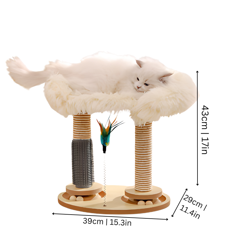 Imagine your kitten darting excitedly between two thrilling sisal balls on durable tracks. They can scratch to their heart’s content on the sturdy posts, keeping their claws healthy and your furniture safe. Plus, there's a special grooming spot right where they need it. It's a complete entertainment hub that keeps them active and engaged, making every day a new adventure.