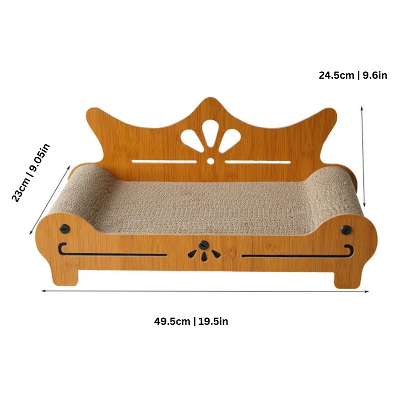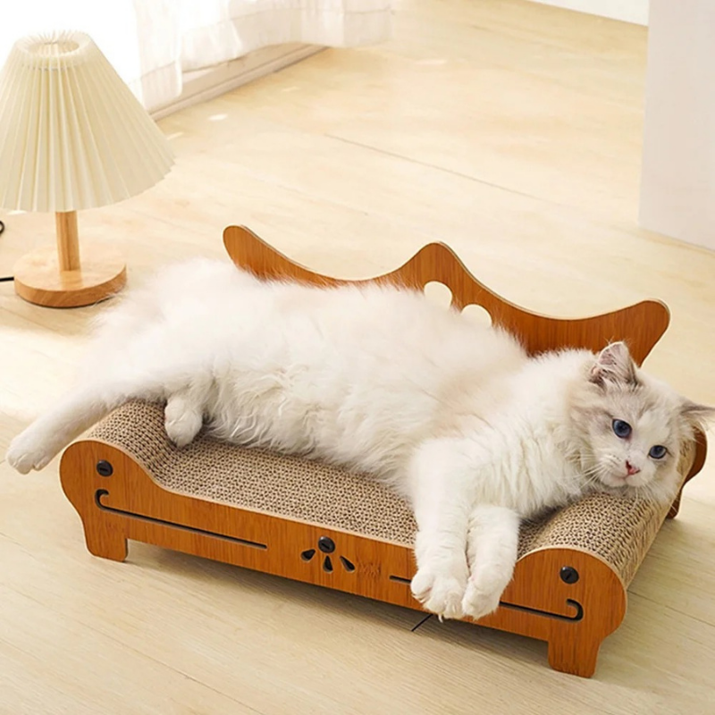 Dive into ScratchSofa, a fusion of premium wood and durable cardboard craftsmanship, not only satisfying your cat's innate scratch instincts but also safeguarding your treasured furniture, ensuring endless play, relaxation, and joy for your beloved feline friend, all while blending in effortlessly.